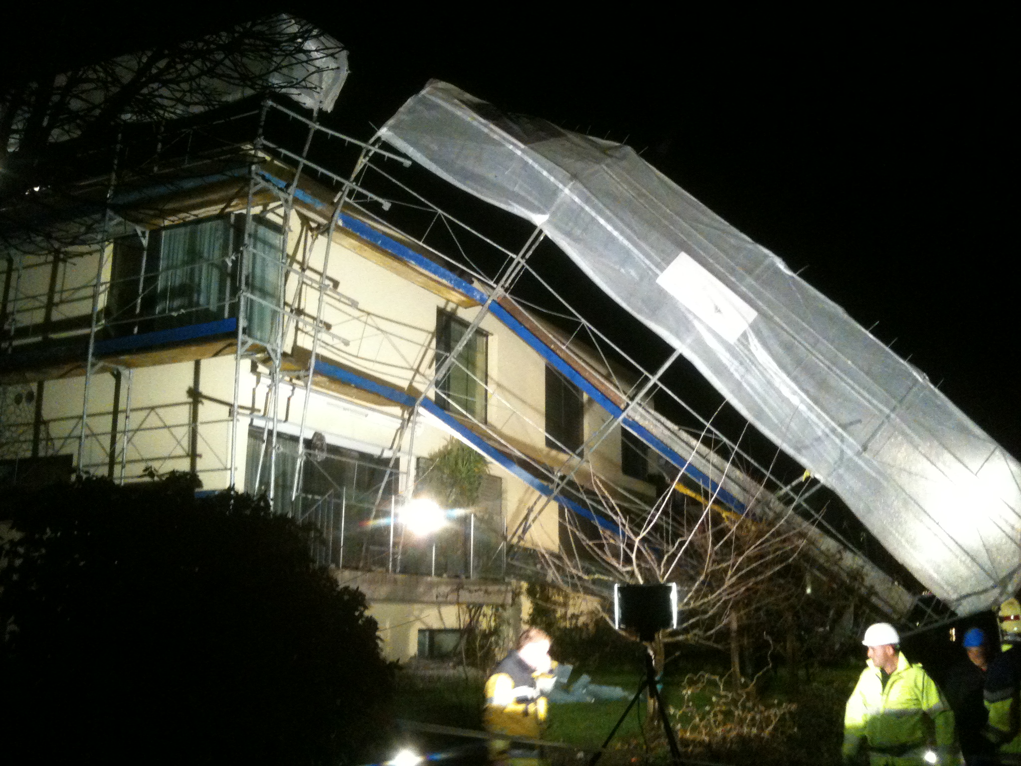 Die Feuerwehr war sehr schnell vor Ort, hatte alles rasch abgesperrt, beleuchtet und das Gerüst gesichert, damit es nicht mehr weiter umkippen konnte.